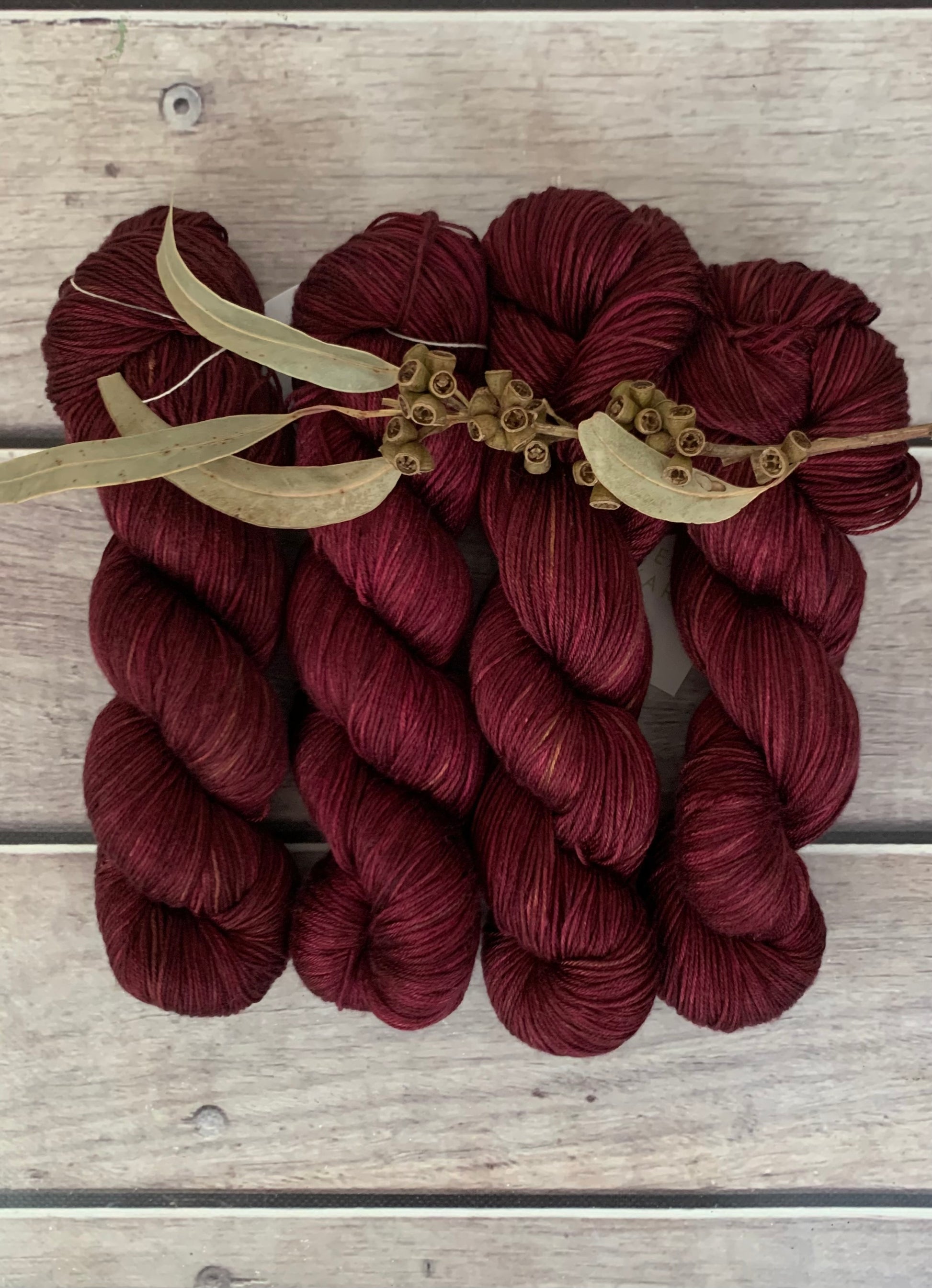 This colour is a deep, wine-soaked red with a strong burgundy base and layers of darker claret and plum running through the skein. Subtle flashes of warm rust and bronze add depth, keeping it rich rather than flat, while the overall tone reads dark, moody, and saturated. It has a slightly worn, autumnal feel—bold and confident, with enough variation to give beautiful movement in fabric without overpowering stitch definition.
