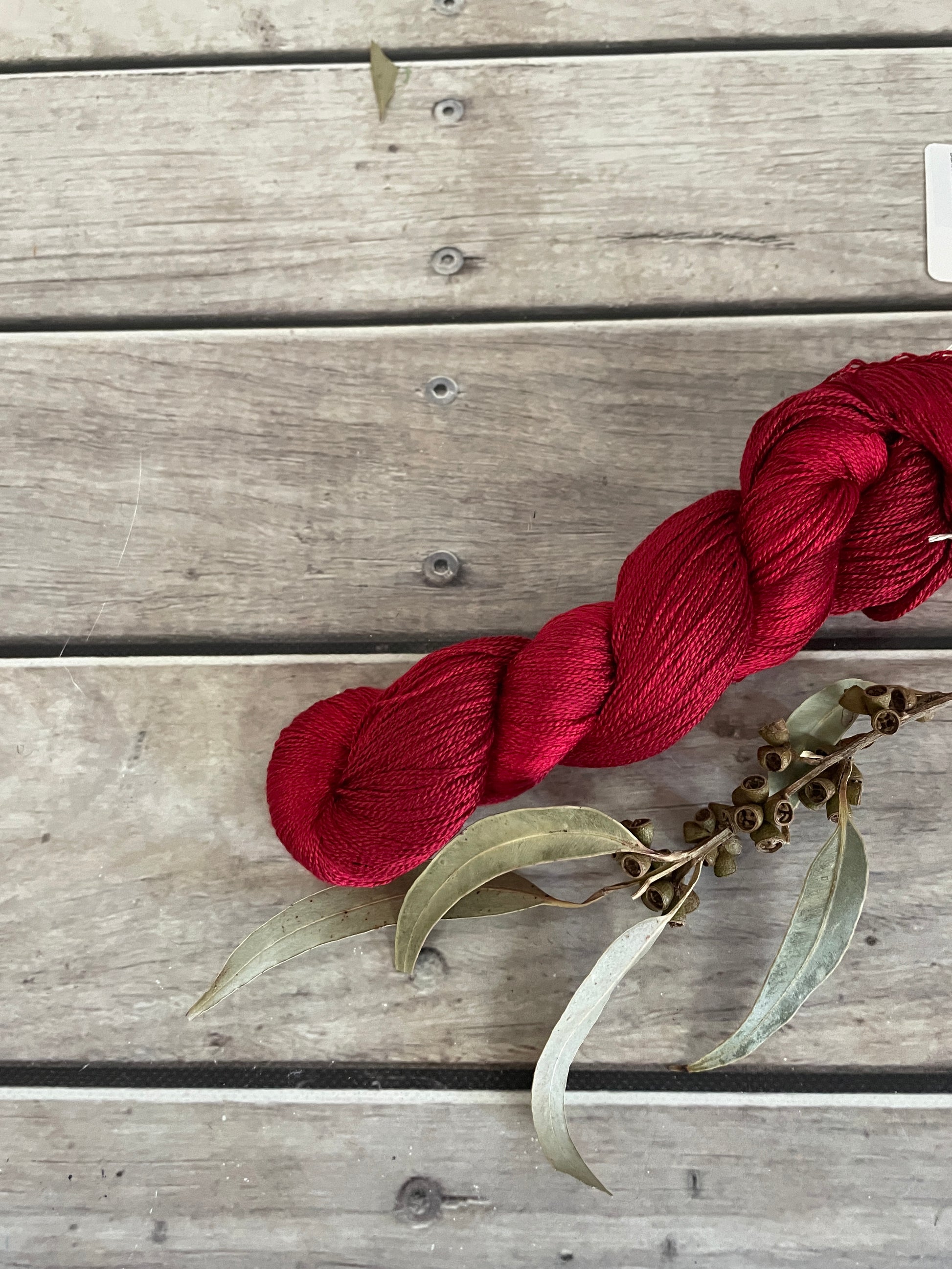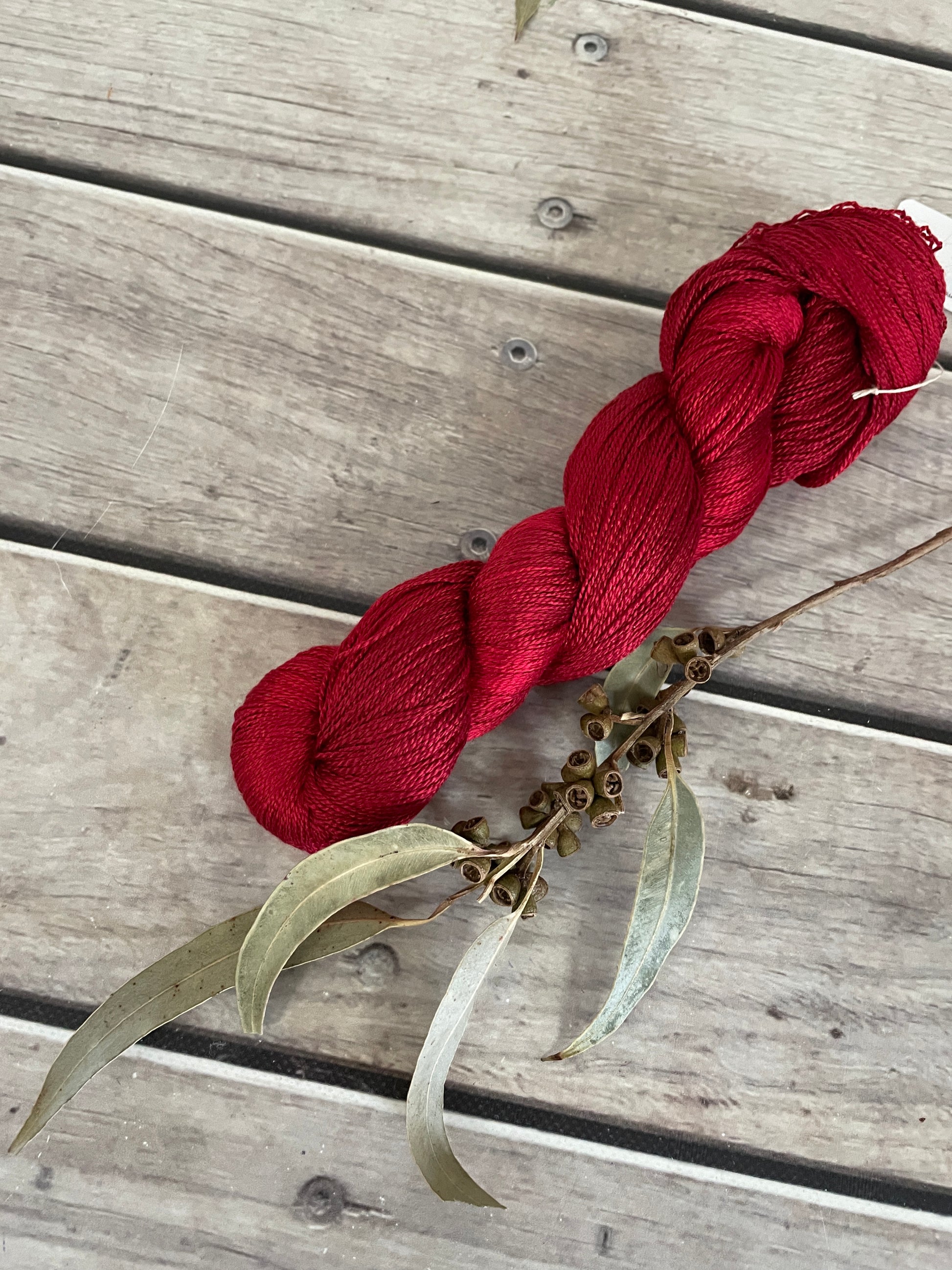 Dark Lacquer Red is a darker more classic deep red (and an adaptation of the Lacquer Red that is part of my line - rich and mysterious. Based on the wonderful heavy red doors and funnery vessels that are found in China as is the regular Lacquer Red but deeper and darker. It the perfect colour for a lustrous silk. Tonal variation throughout the skein.