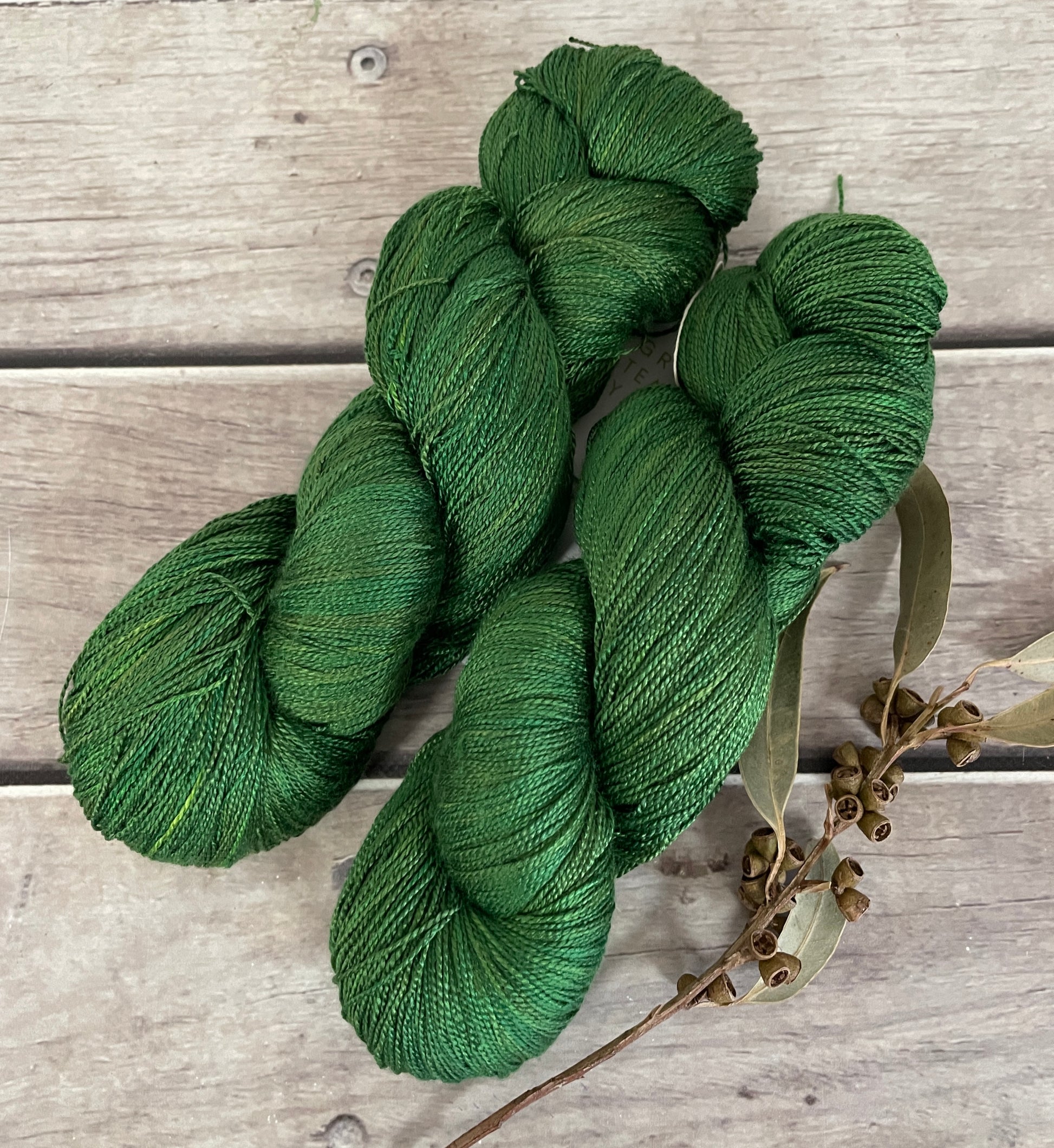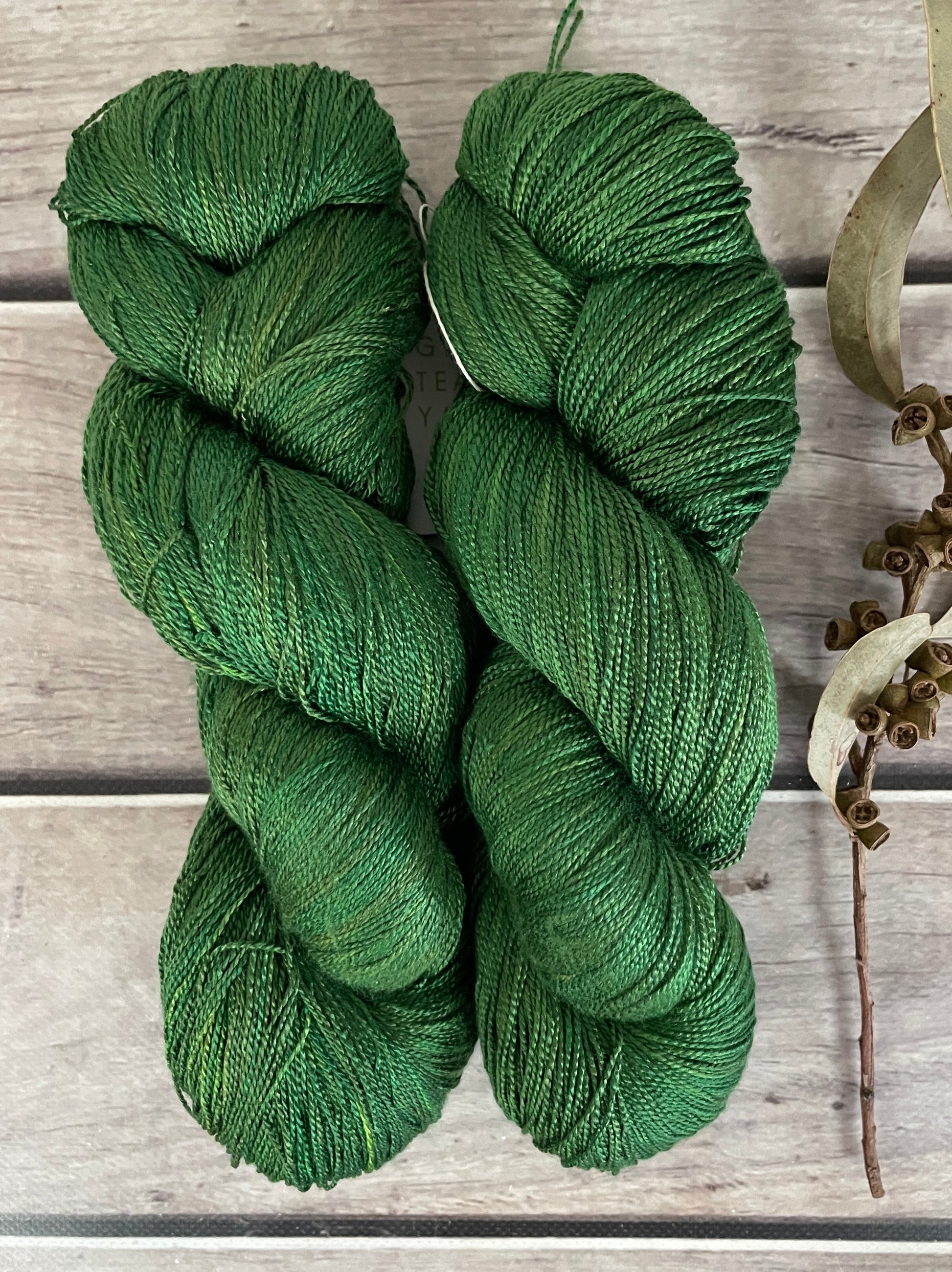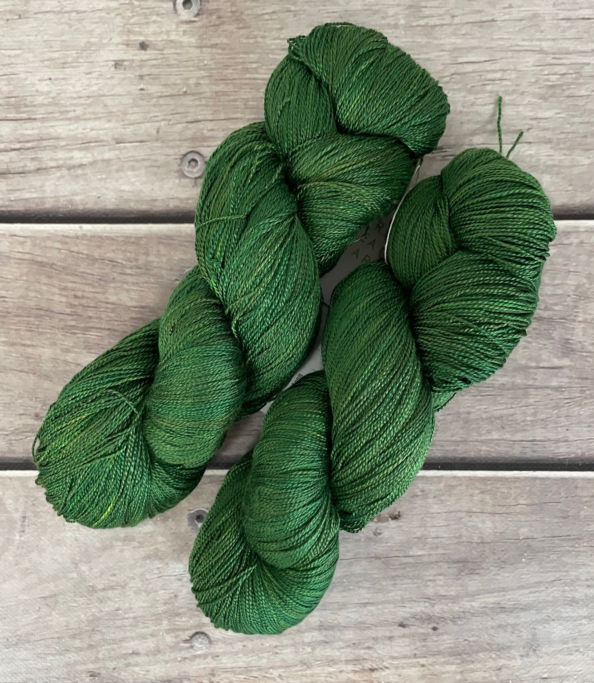 Forest Moss is a deep, grounded green with the quiet richness of woodland foliage. Subtle tonal shifts run through the skein, giving it depth and movement, while a gentle sheen highlights the colour’s natural vibrancy. Reminiscent of moss-covered stone in shaded light, this shade carries an organic, timeless feel. It works beautifully on its own or paired with soft neutrals, golden tones, or other woodland-inspired colours.