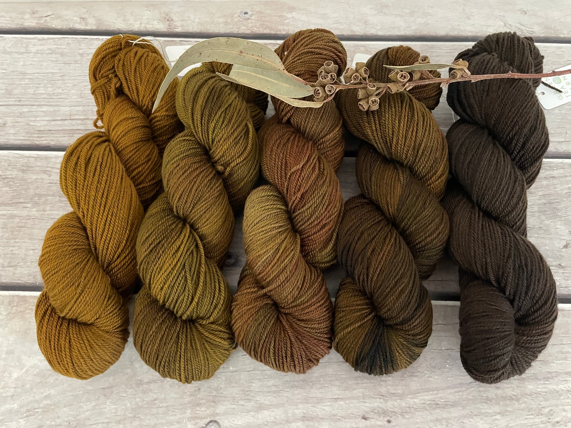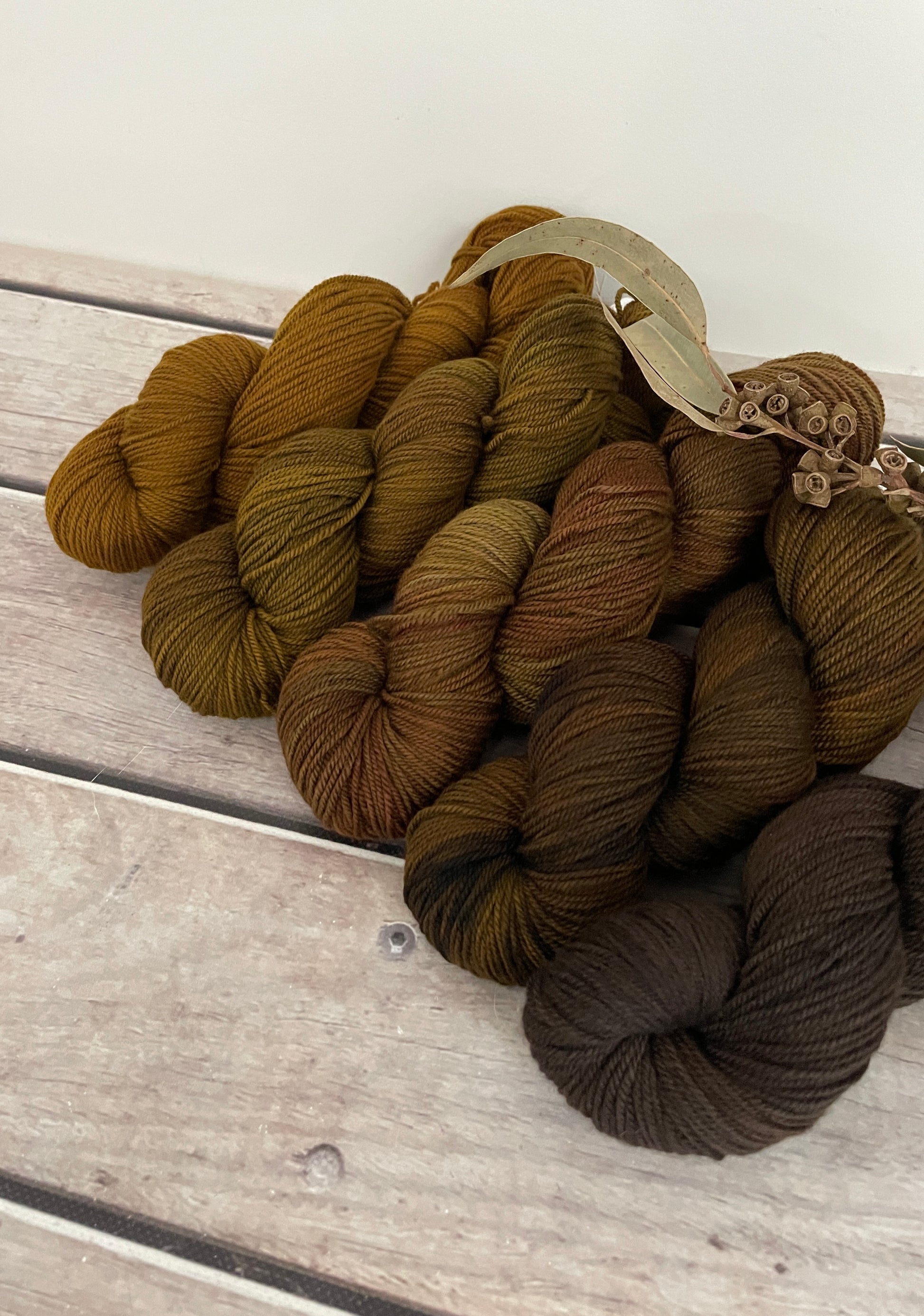 Named for the pattern it was designed to showcase, and for the yarn itself, Rose is a grounded, earthy fade on our organic 5 ply merino base. This quartet moves from a warm golden ochre through olive-tinged toffee, into rich walnut, and finally settles into a deep, dark chocolate brown.