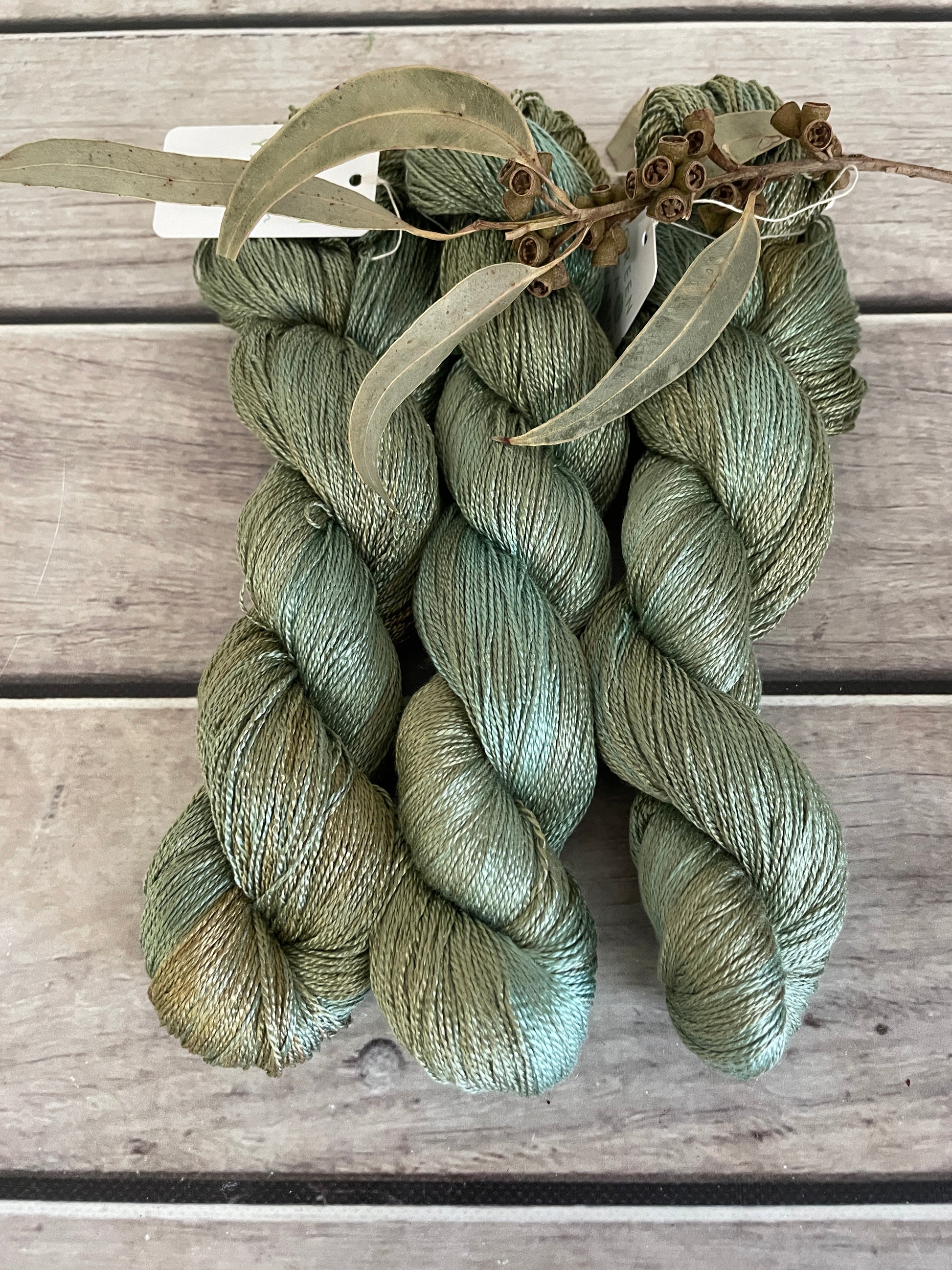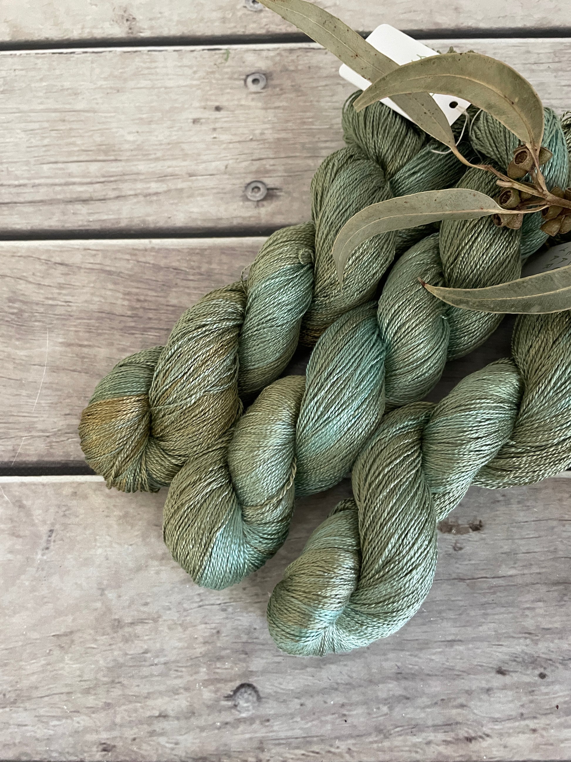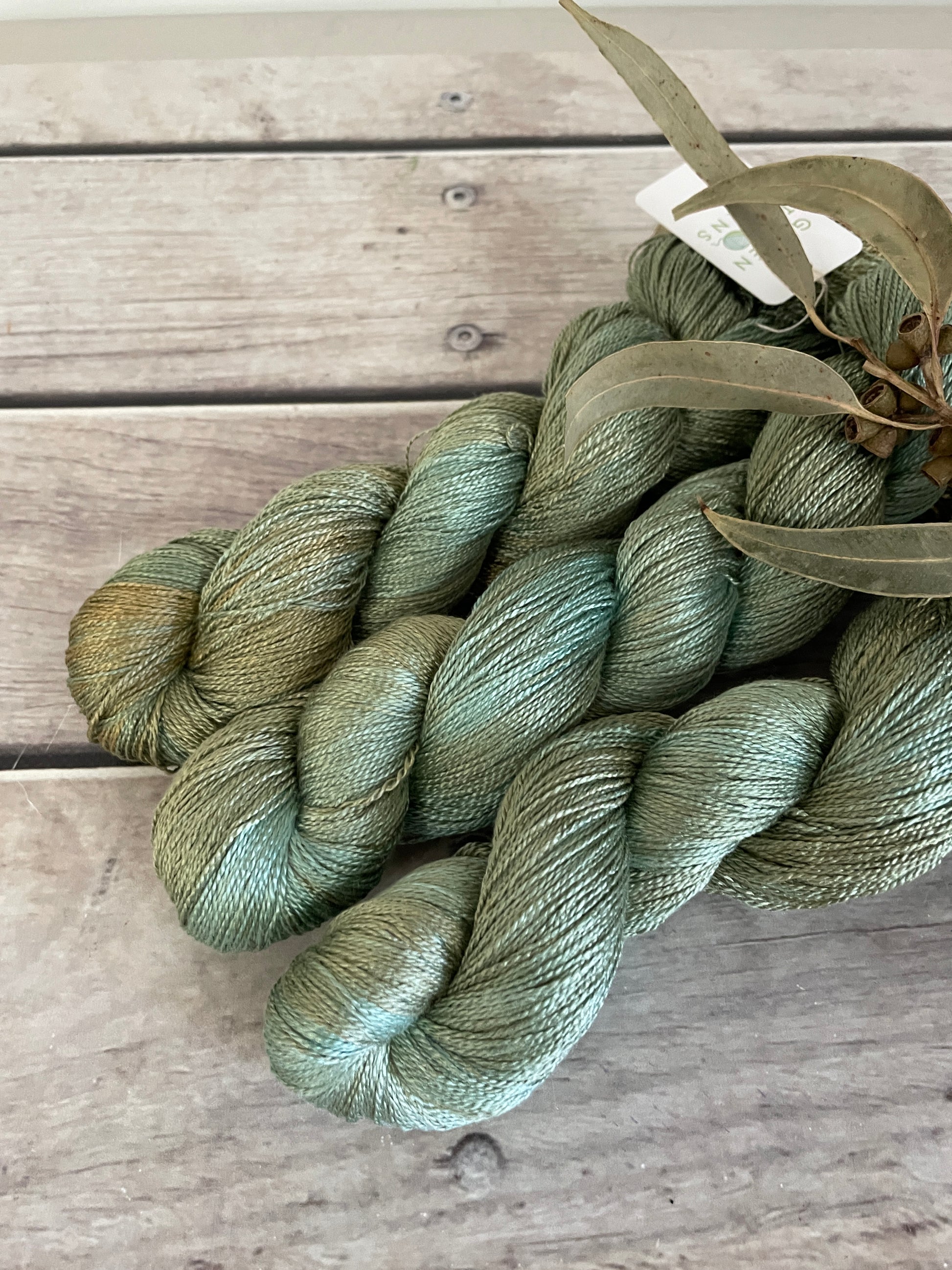 The colour Sea Green in this yarn is a soft, silken blend of muted green and gentle aqua tones, with a delicate shimmer that catches the light. It shifts subtly between cool golden sage and light ocean hues, with occasional golden undertones that lend warmth and depth. The result is a tranquil, natural shade that evokes seaweed in shallow coastal waters or sunlight glancing off calm waves — peaceful, balanced, and quietly elegant.