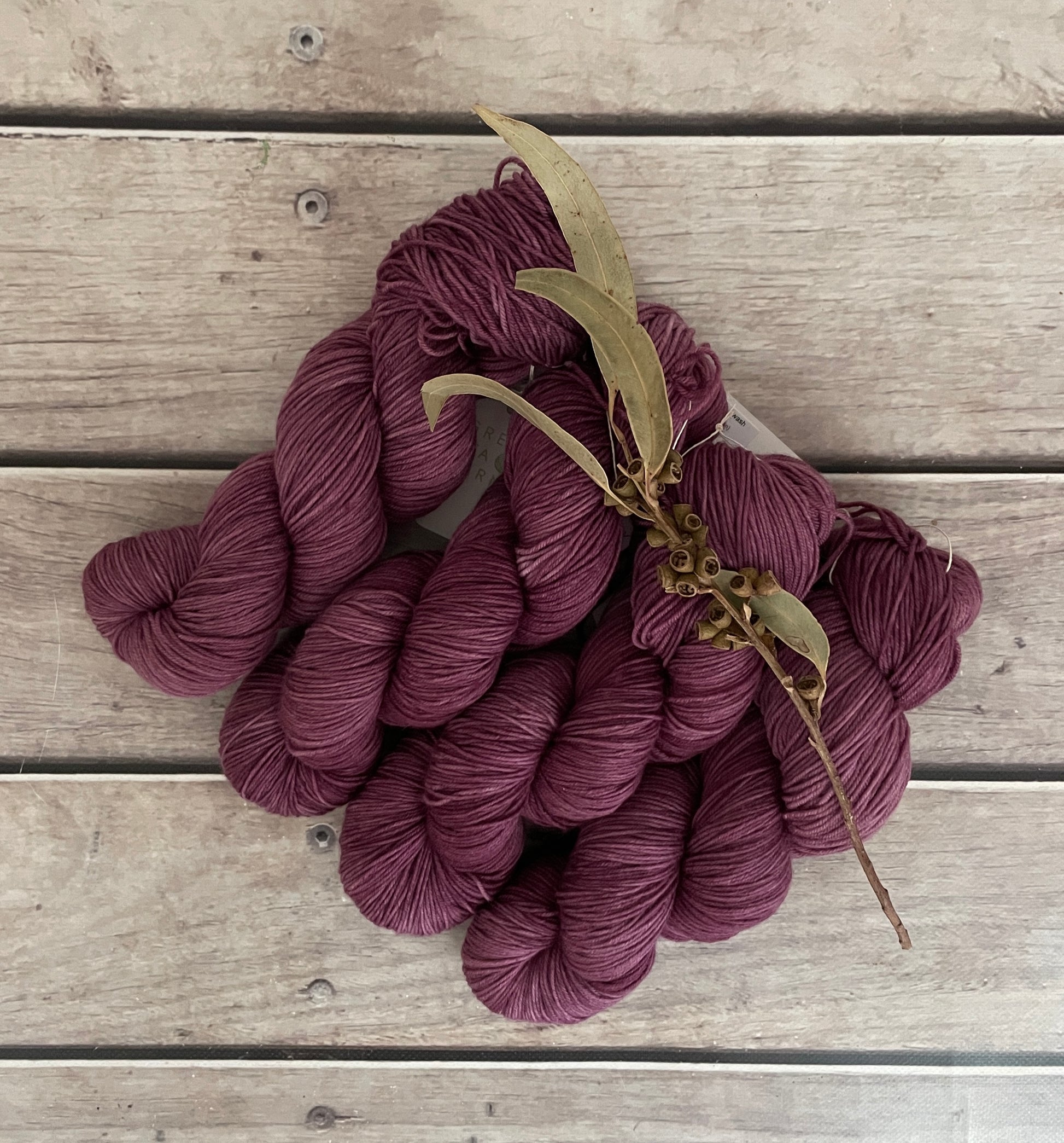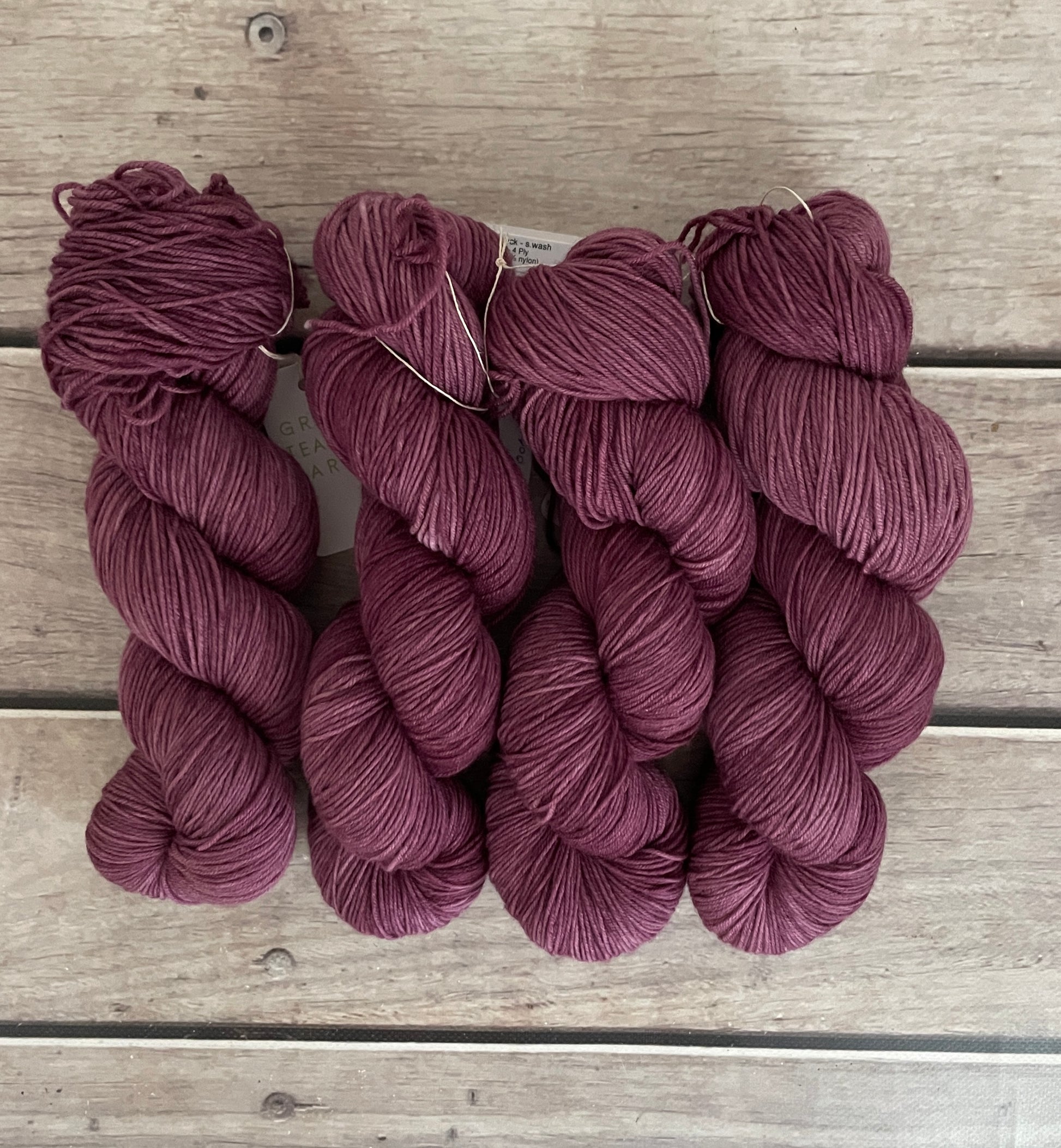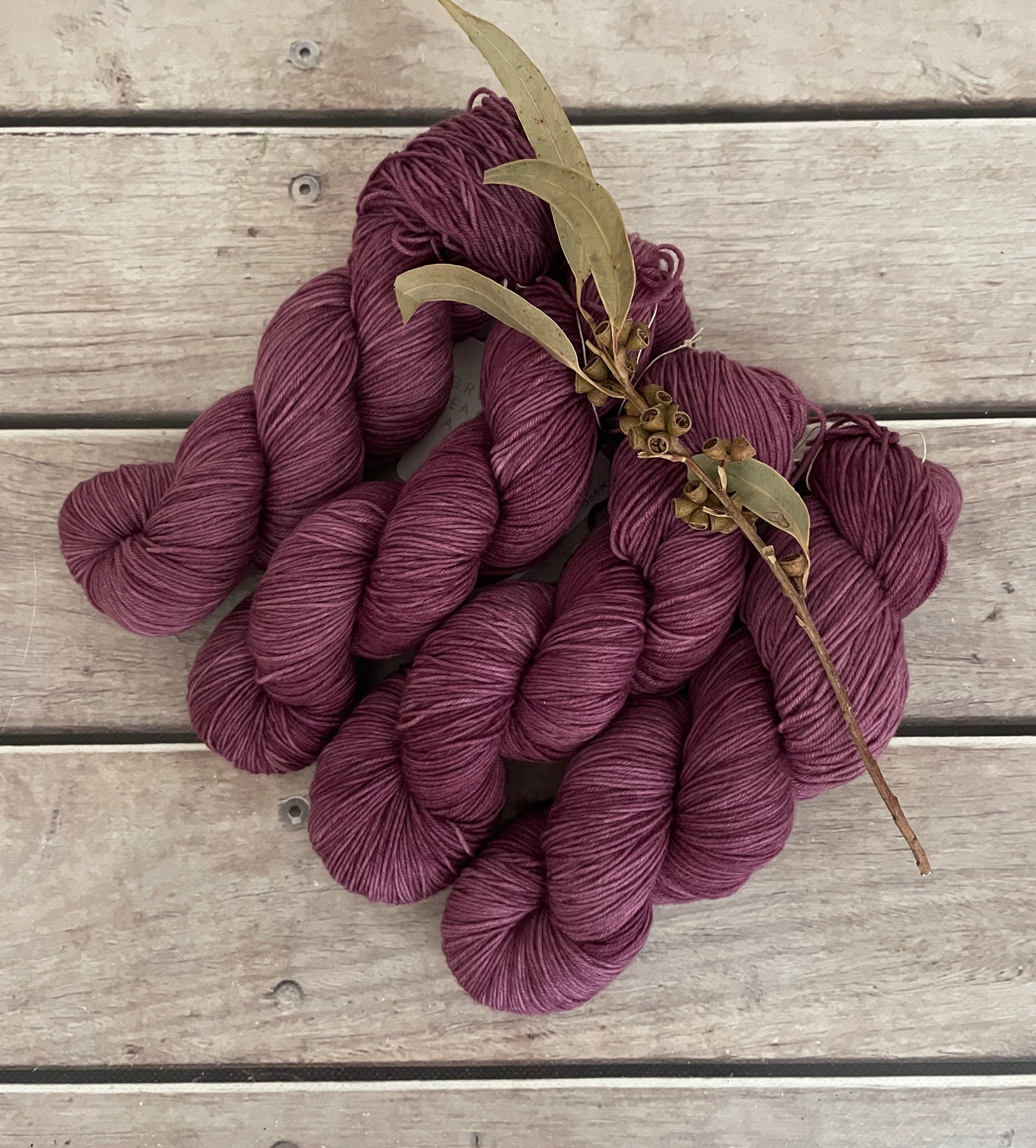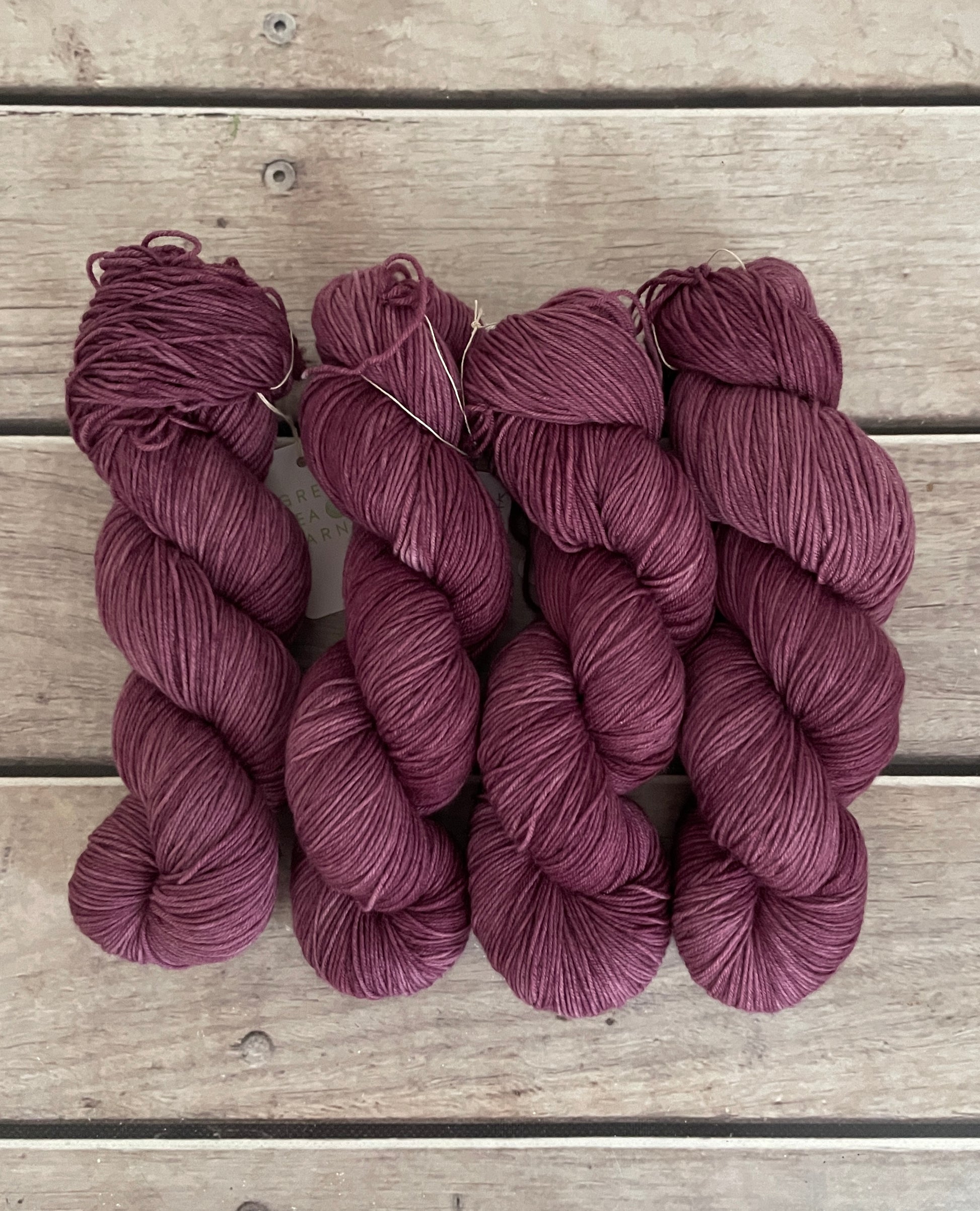 In the skein, Grapeskins shows soft tonal shifts that move from deeper mulberry shadows into lighter, rosy-plum highlights where the light catches the twist of the yarn. This variation gives the colour a lived-in, organic quality that works beautifully in both textured knitting and simple stockinette.