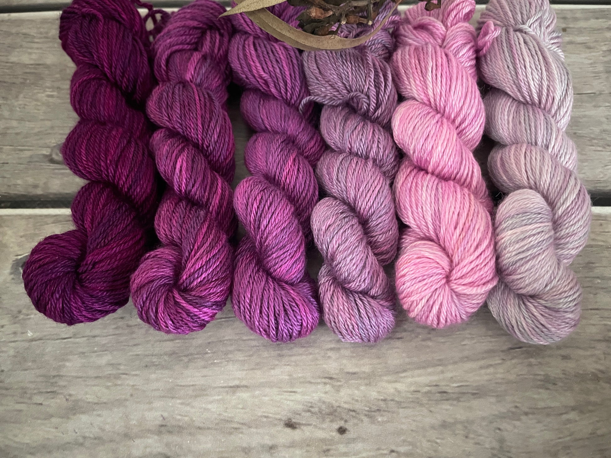 6 x 20g mini skeins of of our gorgeous Jasmine Yarn in a totally wicked fade... Just enough for a shawl or some other little treasure.