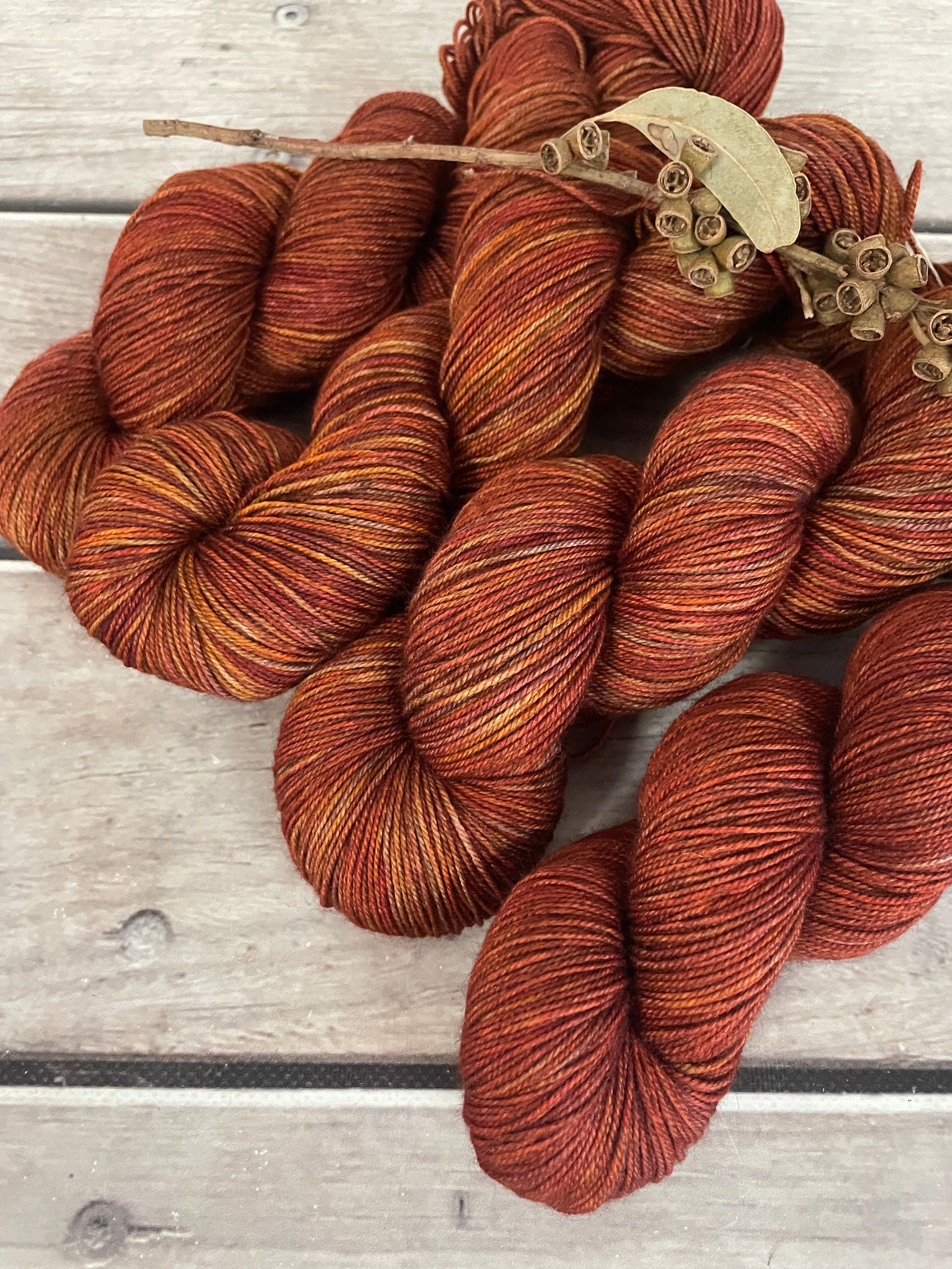 Red Kangaroo is a rich, sun-baked red drawn straight from the Australian landscape. It carries the warmth of iron-rich earth and desert dust, layered with tonal shifts of burnt sienna, ochre and deep russet. In some lights it leans towards a glowing terracotta; in others, the deeper chestnut undertones rise to the surface, giving the colour depth and movement across the skein.
