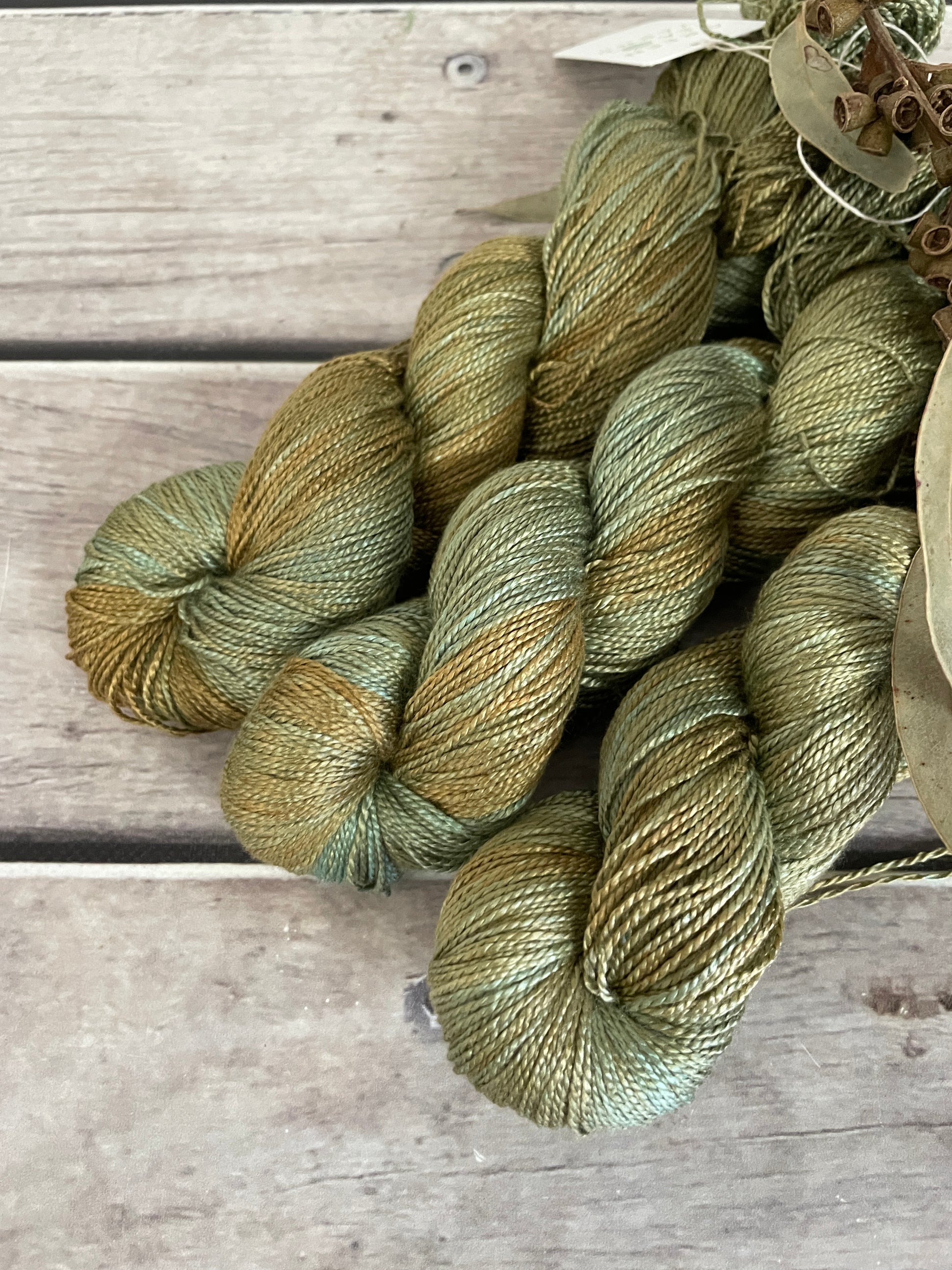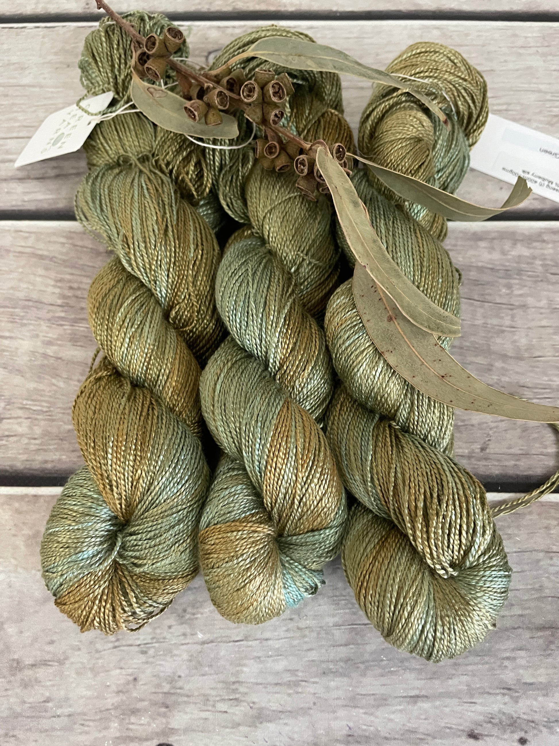 The colour Sea Green in this yarn is a soft, silken blend of muted green and gentle aqua tones, with a delicate shimmer that catches the light. It shifts subtly between cool golden sage and light ocean hues, with occasional golden undertones that lend warmth and depth. The result is a tranquil, natural shade that evokes seaweed in shallow coastal waters or sunlight glancing off calm waves — peaceful, balanced, and quietly elegant.